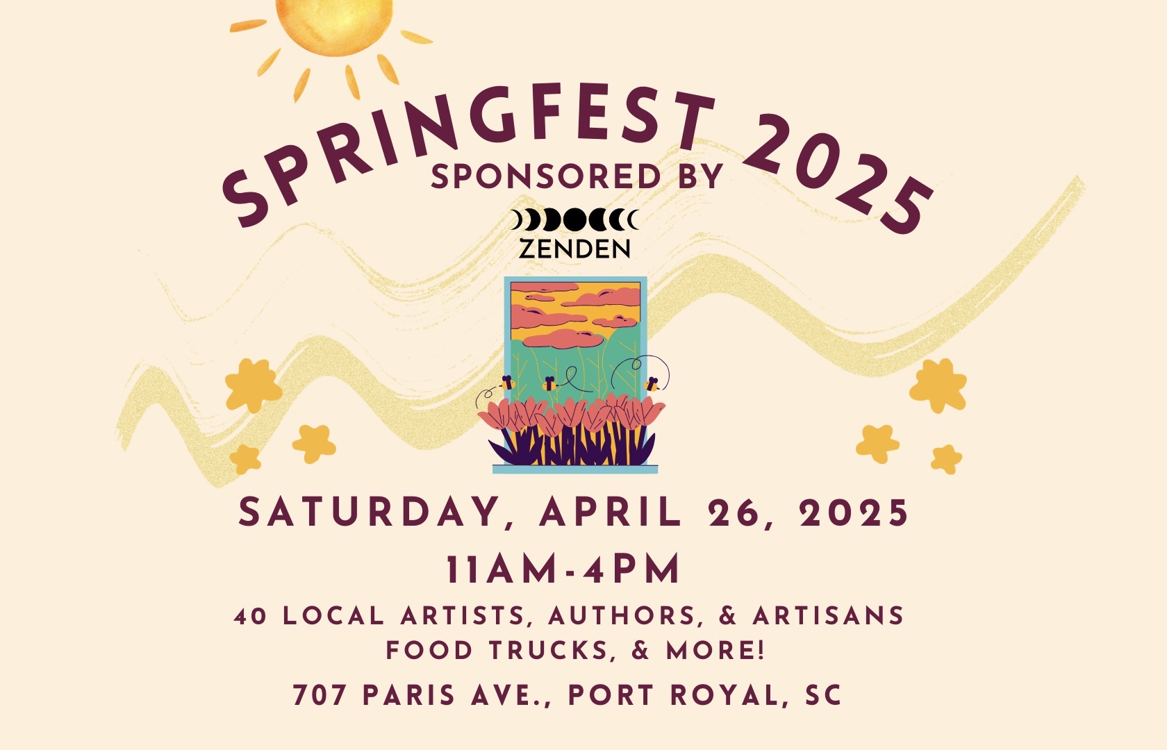 🌸 Saturday, April 26 – Springfest 2025 in Port Royal – Sponsored by ZenDen 📍 707 Paris Ave, Springfest celebrates the season with local vendors, live music, and activities for all ages. 11AM - 4PM. It’s a perfect way to enjoy the springtime atmosphere in Beaufort.