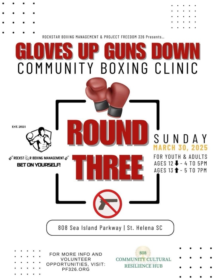 š„ Gloves Up, Guns Down: Community Boxing Clinic | Sun., 4 p.m. š 808 Sea Island Pwky. This event is hosted my Project Freedom 326, a local organization dedicated to providing youth with a safe and supportive environment where they can stay active, express themselves, and have fun.