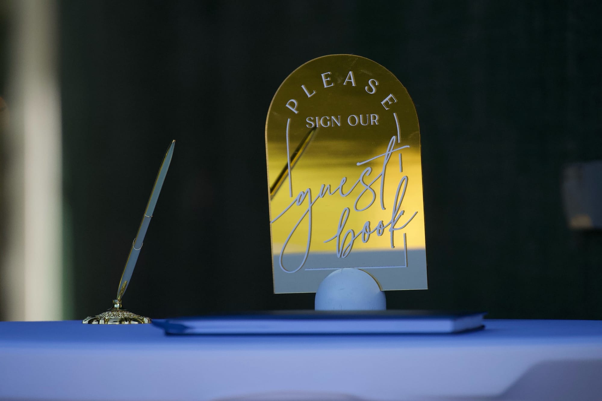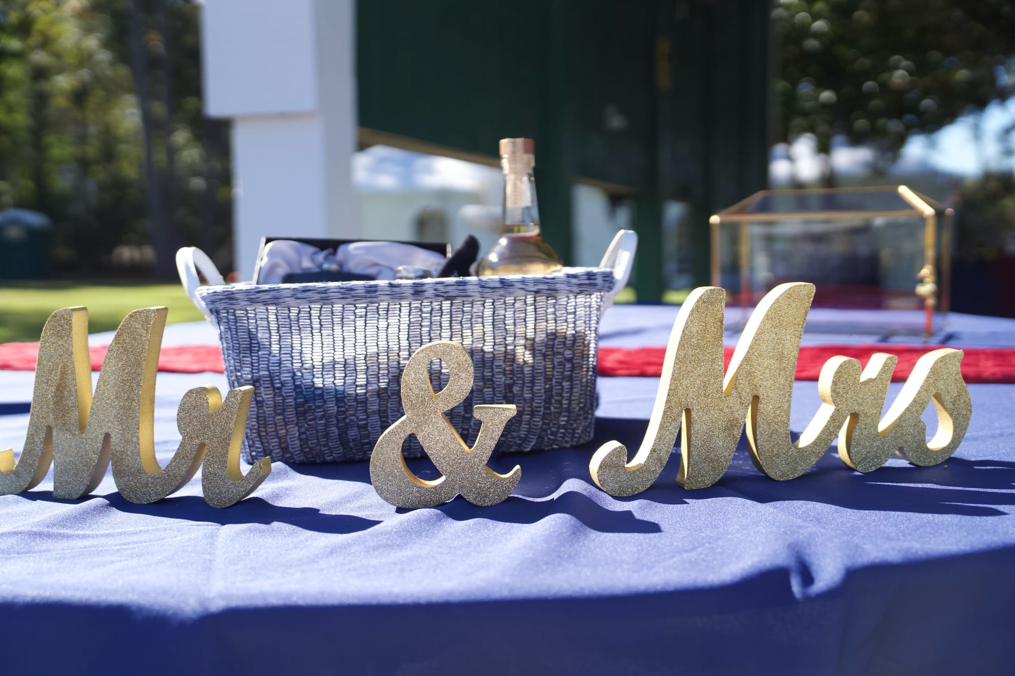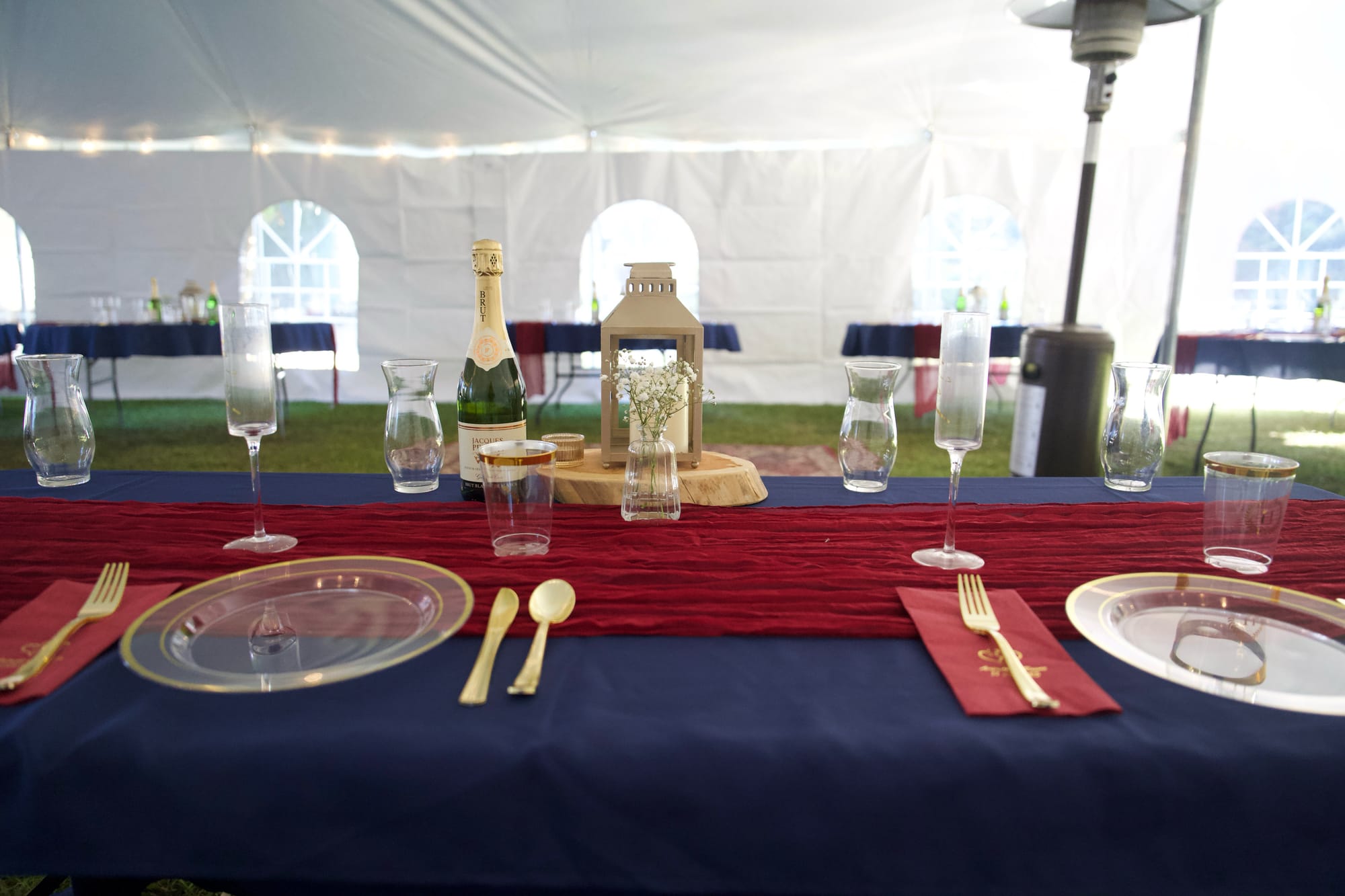 The reception inside the tent achieved that perfect Lowcountry aesthetic: rustic texture meeting refined polish. Long tables were draped in rich navy linen, accented by deep burgundy velvet runners that introduced a warm, luxurious feel. Each place setting featured a bright gold charger and tall champagne flutes, offering a refined contrast against the dark cloth. Centerpieces subtly enhanced the natural view outside, mixing clear glass vases and lanterns set on rough-hewn wood slices, finished with simple sprigs of baby’s breath and greenery.