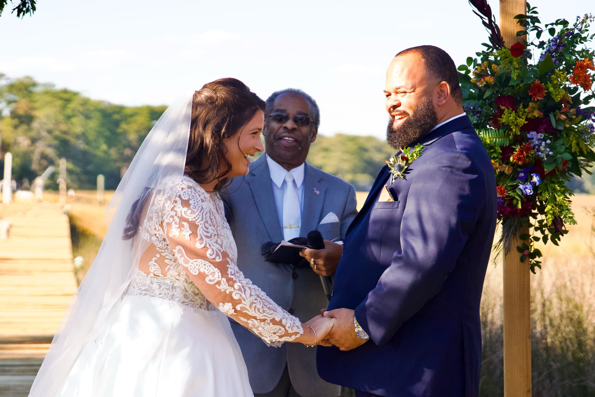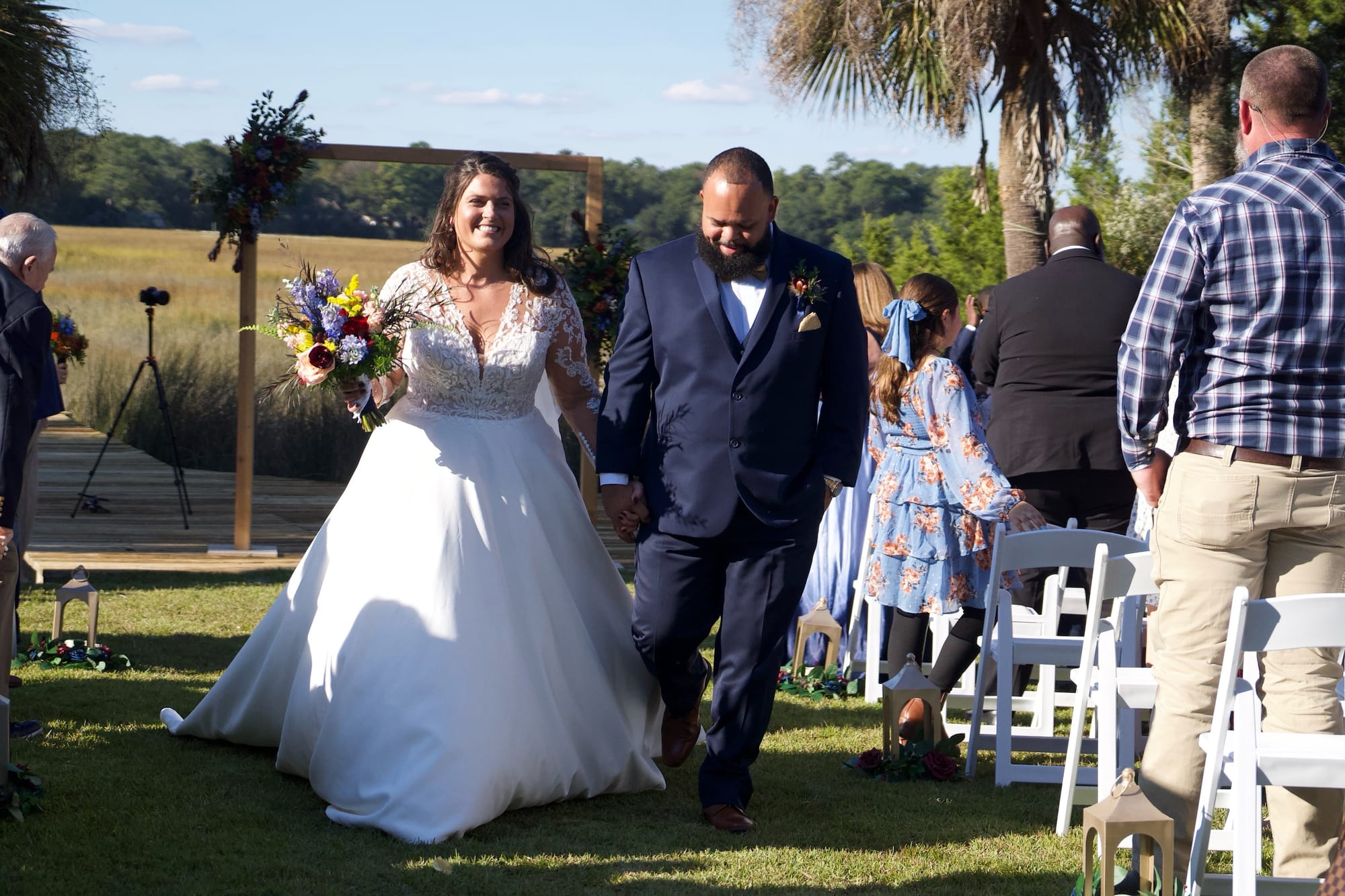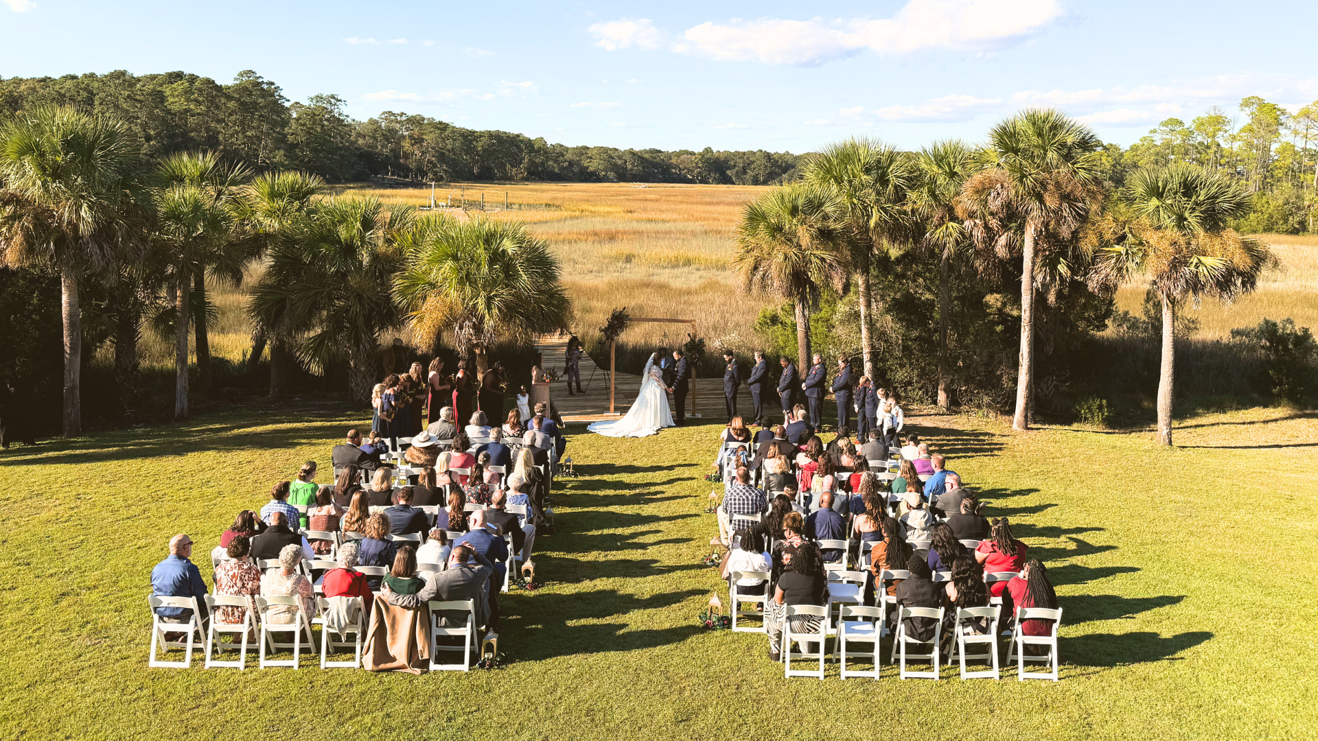 The ceremony, officiated by Reverend Stephen Brown of Central Baptist Church of Beaufort, took place on a wide lawn overlooking the marsh. From the moment the couple joined hands beneath a natural wooden arch, the day unfolded with a thoughtful blend of classic Lowcountry simplicity and striking, modern elegance.