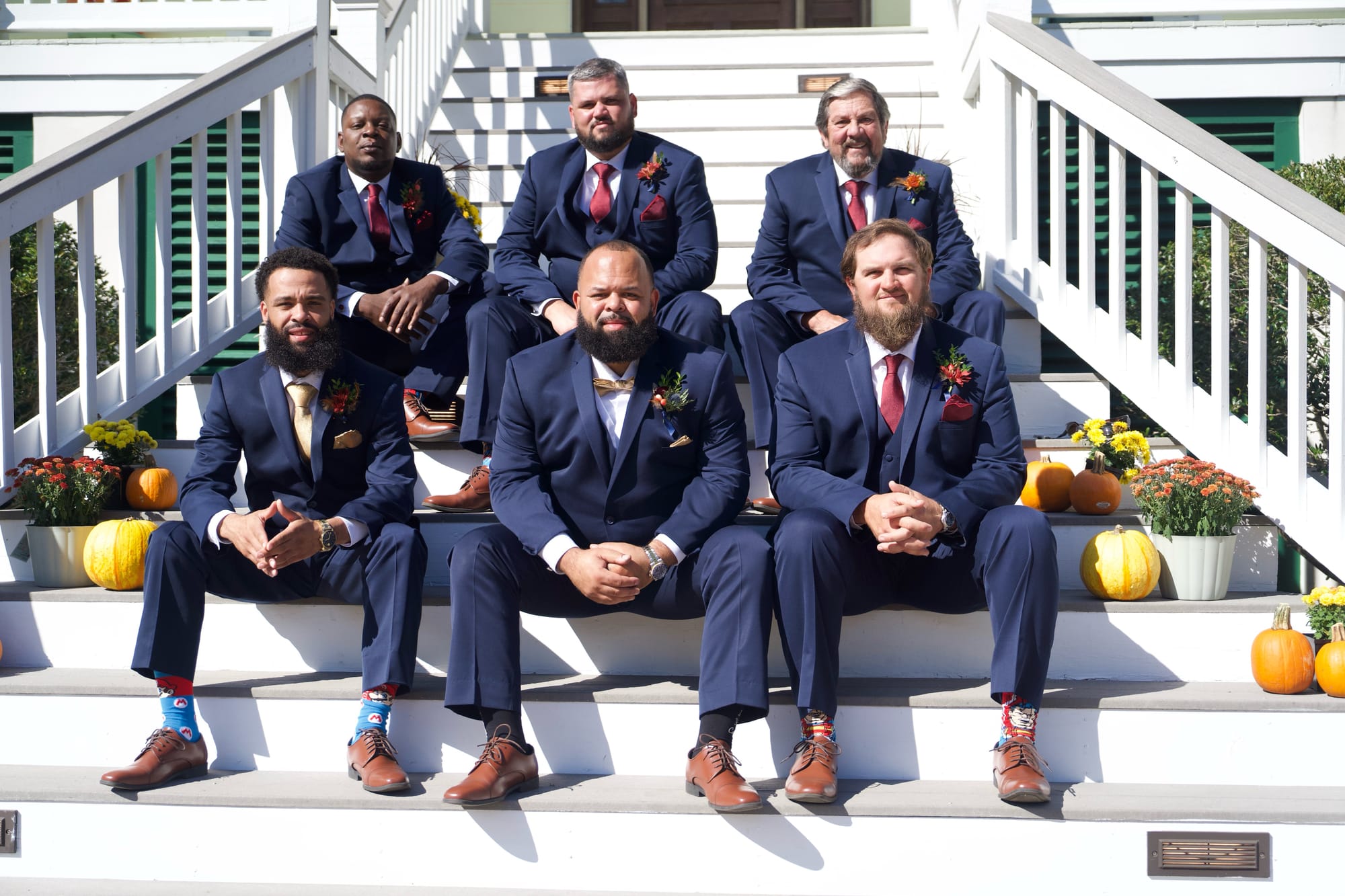Complementing the natural backdrop, the entrance was accented with autumnal harvest decor, including pumpkins and potted mums, grounding the affair firmly in the beauty of the season. The wedding party complemented this striking palette perfectly: bridesmaids wore sophisticated gowns in wine tones, while the groomsmen were sharp in classic navy suits.