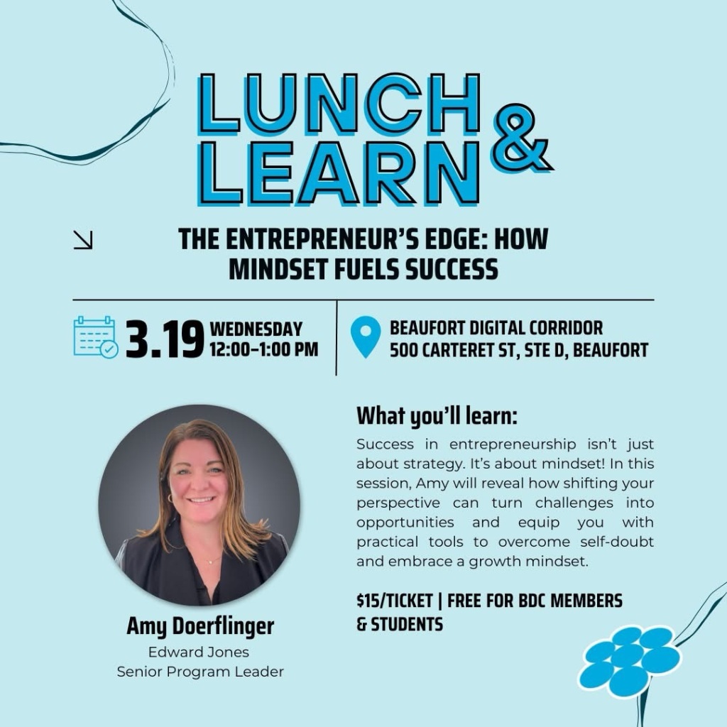 🚀 Ready to gain The Entrepreneur’s Edge? Join the Beaufort Digital Corridor on Wednesday, March 19 at noon with guest speaker Amy Doerflinger. Sponsored by SNS Technologies, get your ticket now: https://lnkd.in/eHT8RVsH