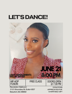 🕺🏾 June 21: Let’s Dance – Free Hip-Hop Fusion Class | 8:00 PM 📍Revolution Ballroom, 2121 Boundary St. Suite #207, Beaufort. Doors open at 7:30 PM. Free class with light refreshments and high vibes. Donations appreciated.