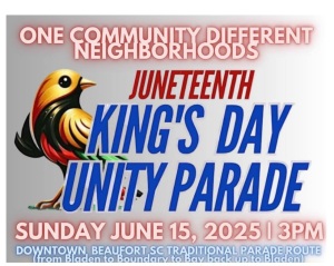 🎉 June 15: Juneteenth Unity Parade – Project Freedom 326 | 3:00 PM – 5:00 PM 📍Downtown Beaufort. Parade honoring Juneteenth and local fathers. Community groups, music, and joy.