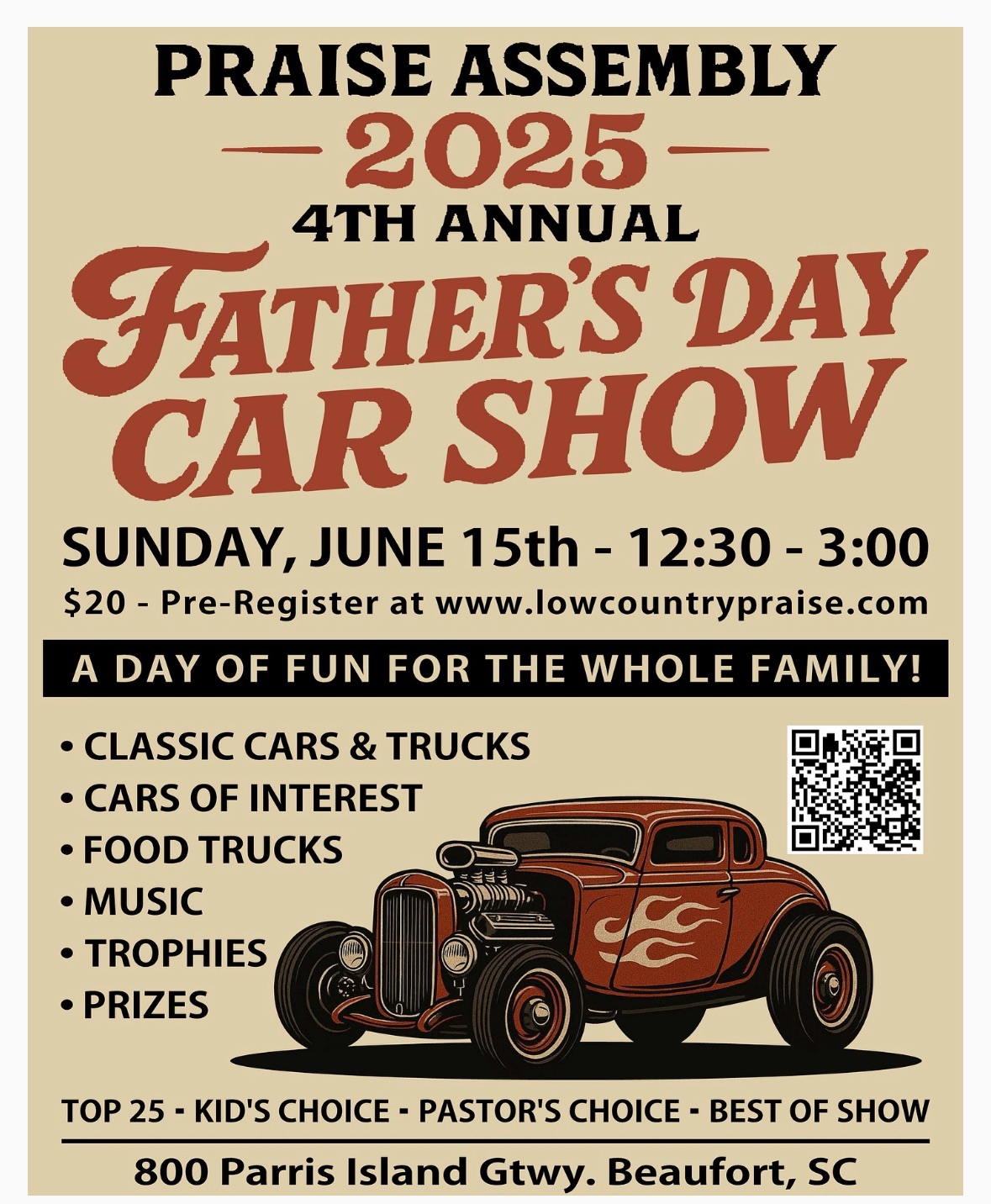 🚗 June 15: Father’s Day Car Show | 12:30 PM – 3:00 PM 📍Praise Assembly, 800 Parris Island Gateway. Classic cars, food trucks, trophies, and family fun. $20 to register your vehicle.