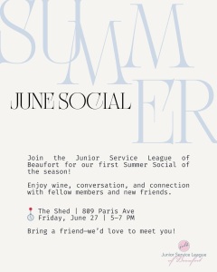 🍷 June 27: Junior Service League Summer Social | 5:00 PM – 7:00 PM 📍The Shed, 809 Paris Ave, Port Royal. Wine, conversation, and community—bring a friend and come meet the JSLB crew!