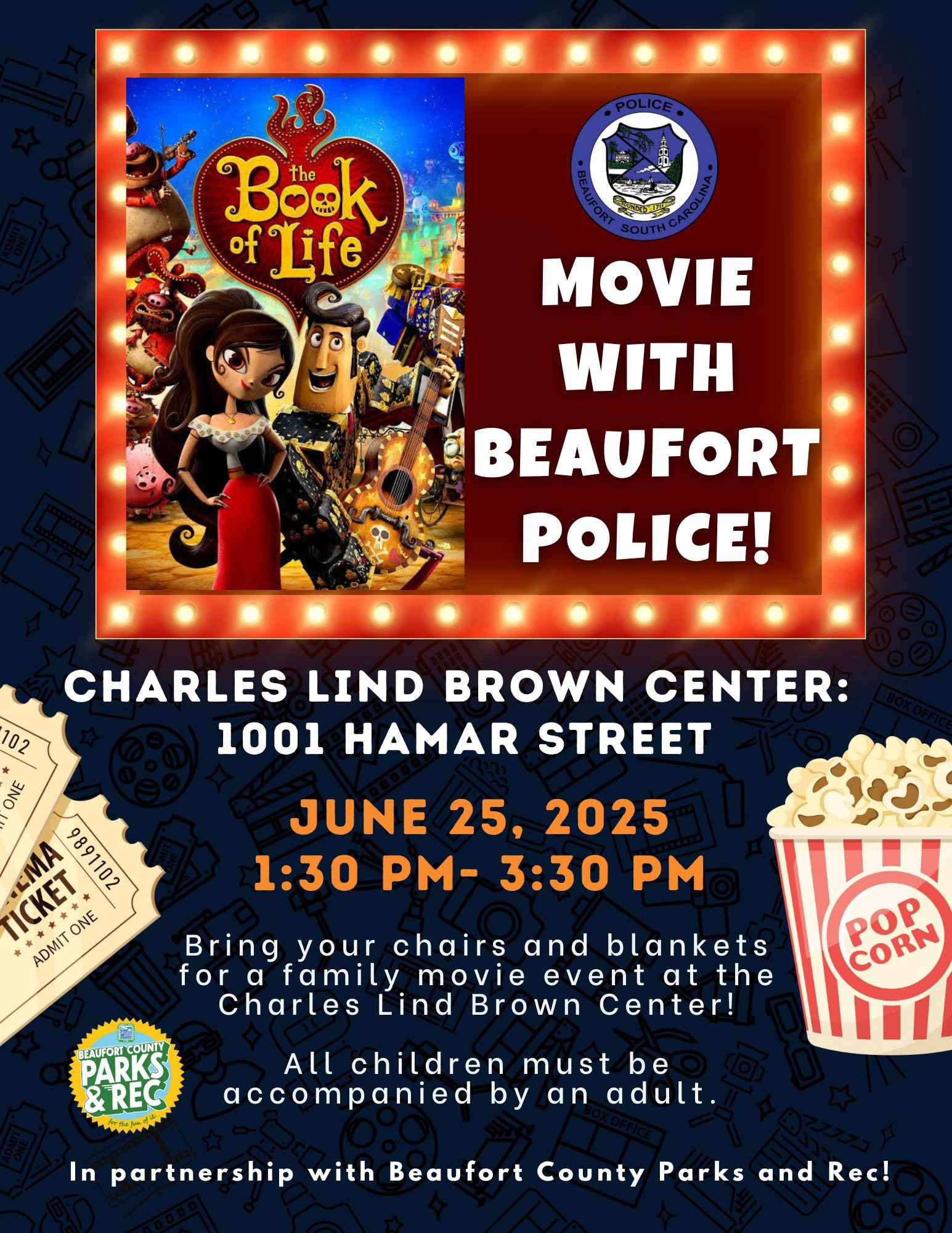 🎬 June 25: Movie with Beaufort Police – The Book of Life | 1:30 PM – 3:30 PM 📍Charles Lind Brown Center, 1001 Hamar Street. Bring blankets and chairs for a fun family movie experience. All kids must be with an adult.