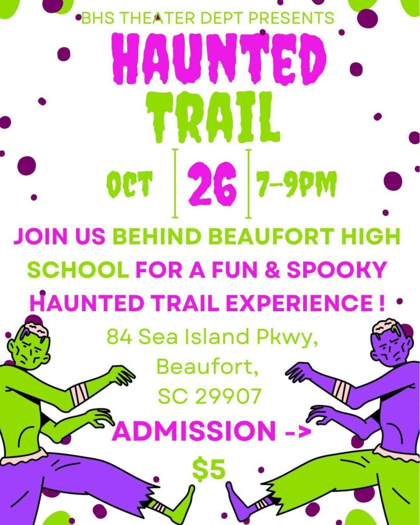 Another event on Sat., Oct. 26th, check out the family-friendly Boo Bash, an all day festival at 1111 11th St. Port Royal. Enjoy live music, costume contests for kids, adults and pets, face painting, bouncy houses and tons of Halloween fun. - Beaufort High School theatre presents: Haunted Trail Join the Beaufort High School theatre department for a spooky Haunted Trail on Saturday, October 26th, from 7:00 to 9:00 PM! Located behind BHS at 84 Sea Island Parkway, admission is just $5. Don’t miss out on this fun Halloween experience!