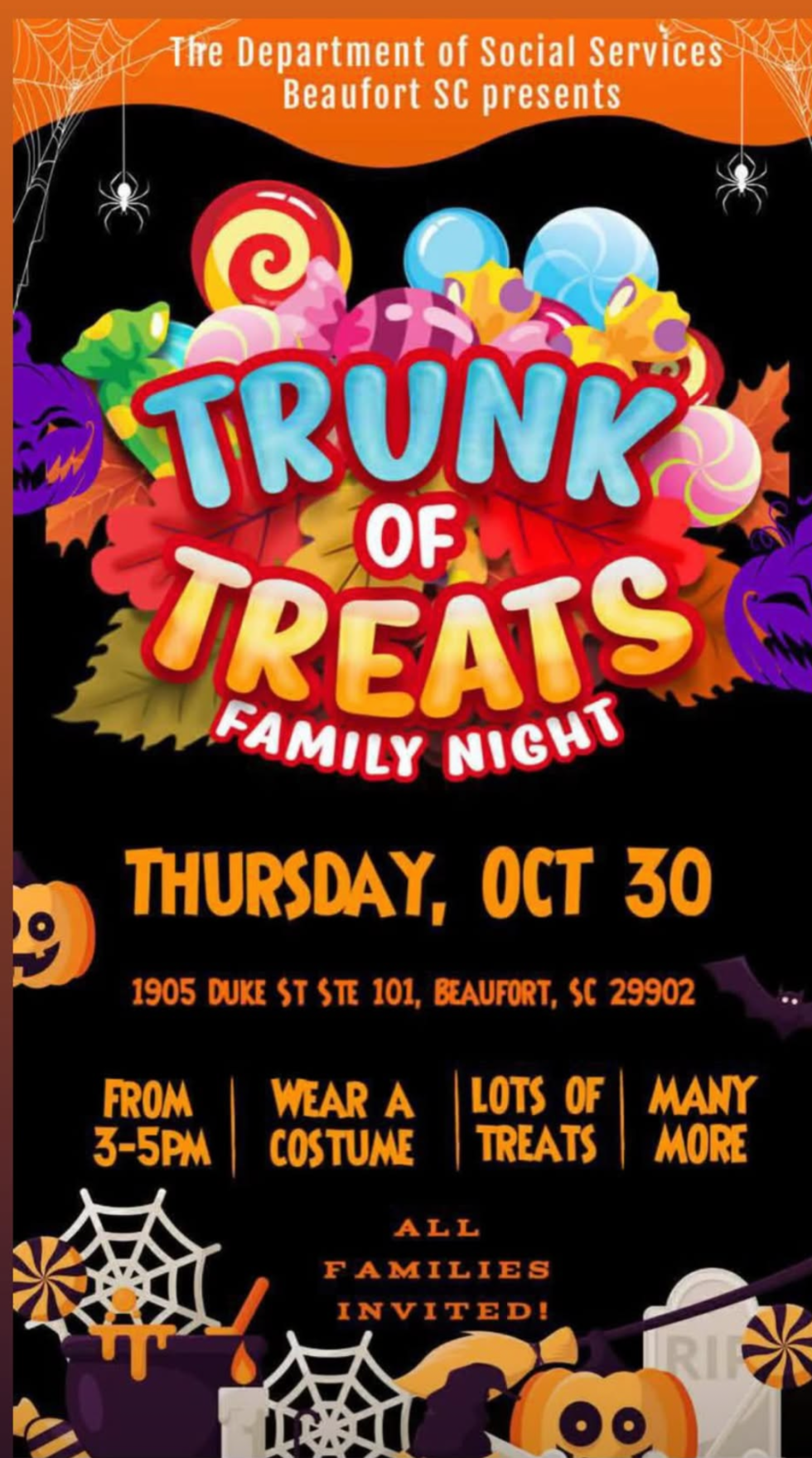 Thu., Oct. 30 | 3–5 pm | 1905 Duke St, Ste 101, Beaufort | Family friendly trunk or treat hosted by Beaufort County DSS with decorated trunks, costumes, candy, and more.