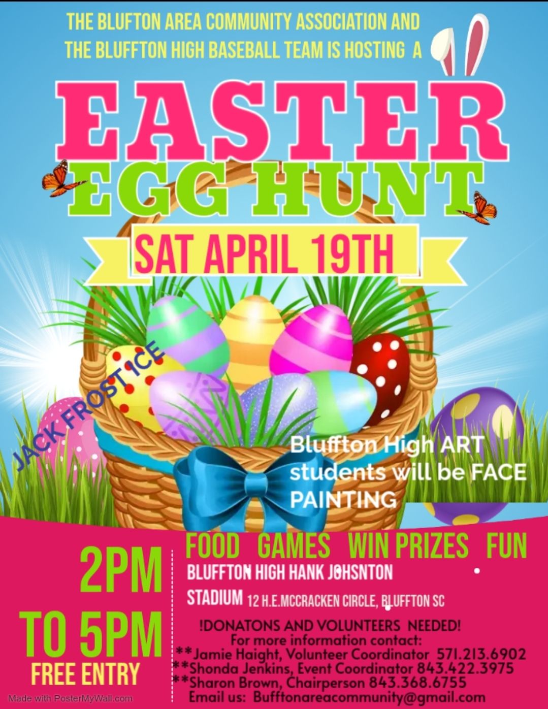 Bluffton Area Easter Egg Hunt | Saturday, April 19, 2025, 2 PM – 5 PM 📍Bluffton High School, Bluffton, SC. | This is a free, family-friendly event hosted by the Bluffton Area Community Association with face painting, games, prizes, music, free food, and a surprise visit from Peter Cottontail—donations accepted. Call 843-368-6755 for more information.
