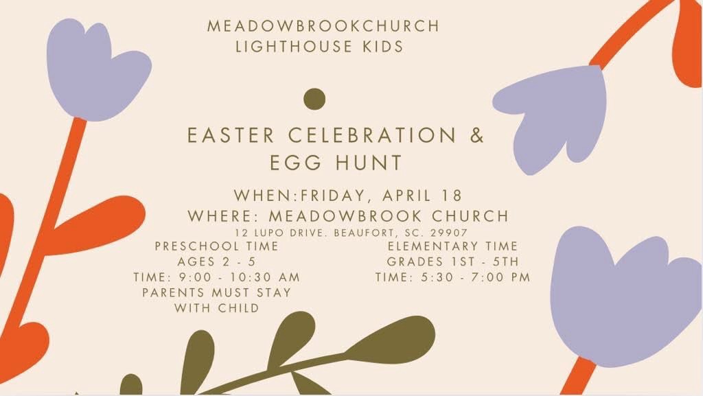 Easter Celebration and Egg Hunt with Meadowbrook Church | Easter egg hunt for preschoolers in the morning from 9-10:30 AM and elementary school students grades 1st through 5th from 5:30 -7:00 PM. 📍12 Lupo Drive Beaufort