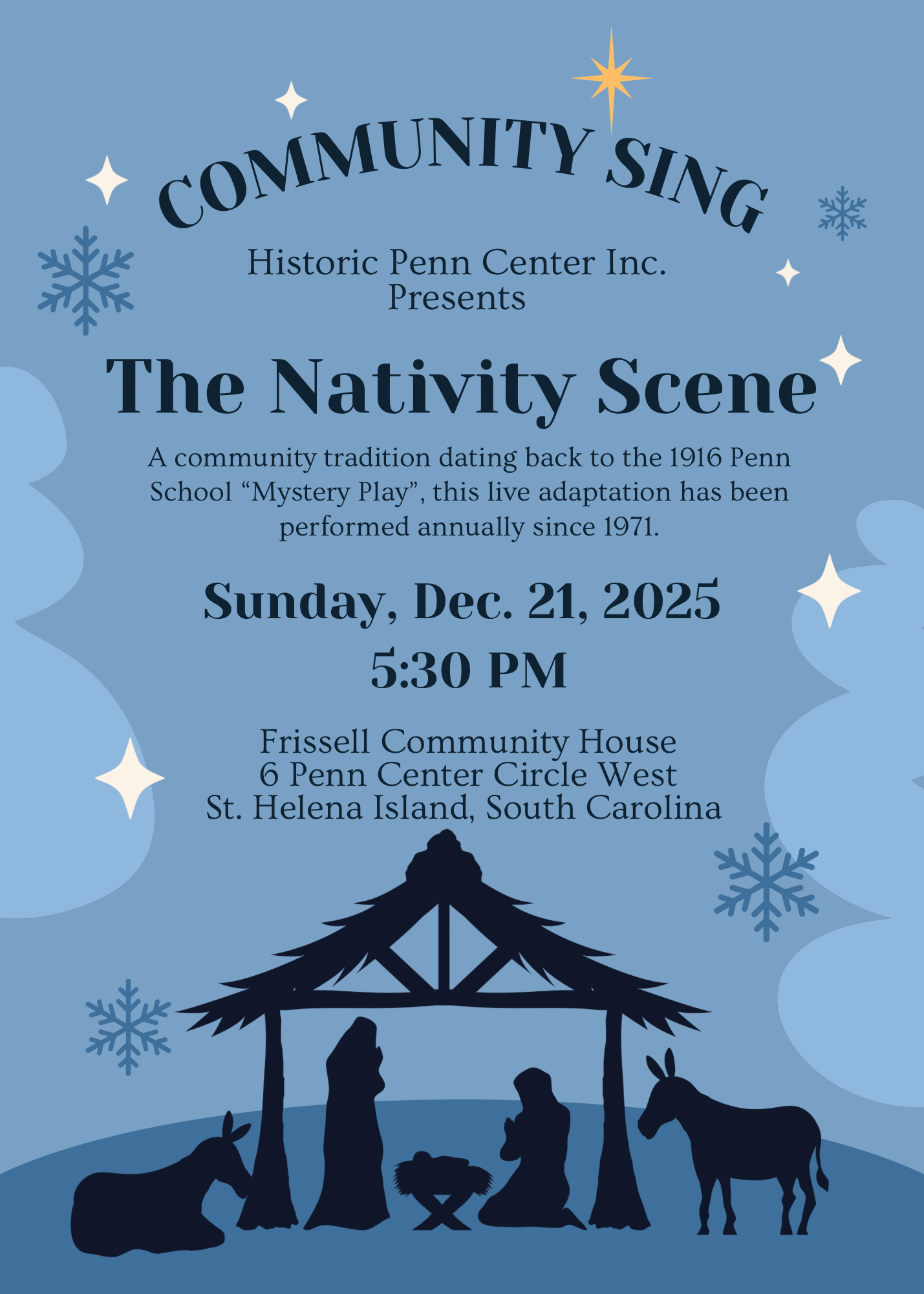 Happening Sunday, December 21, this event has been a staple in the Gullah Geechee community since the early 1900s. Come check out this free community sing to hear Christmas songs and see the beautiful live nativity scene. The event takes place at Penn Center's Frissell Hall on St. Helena Island. Doors open at 5pm.