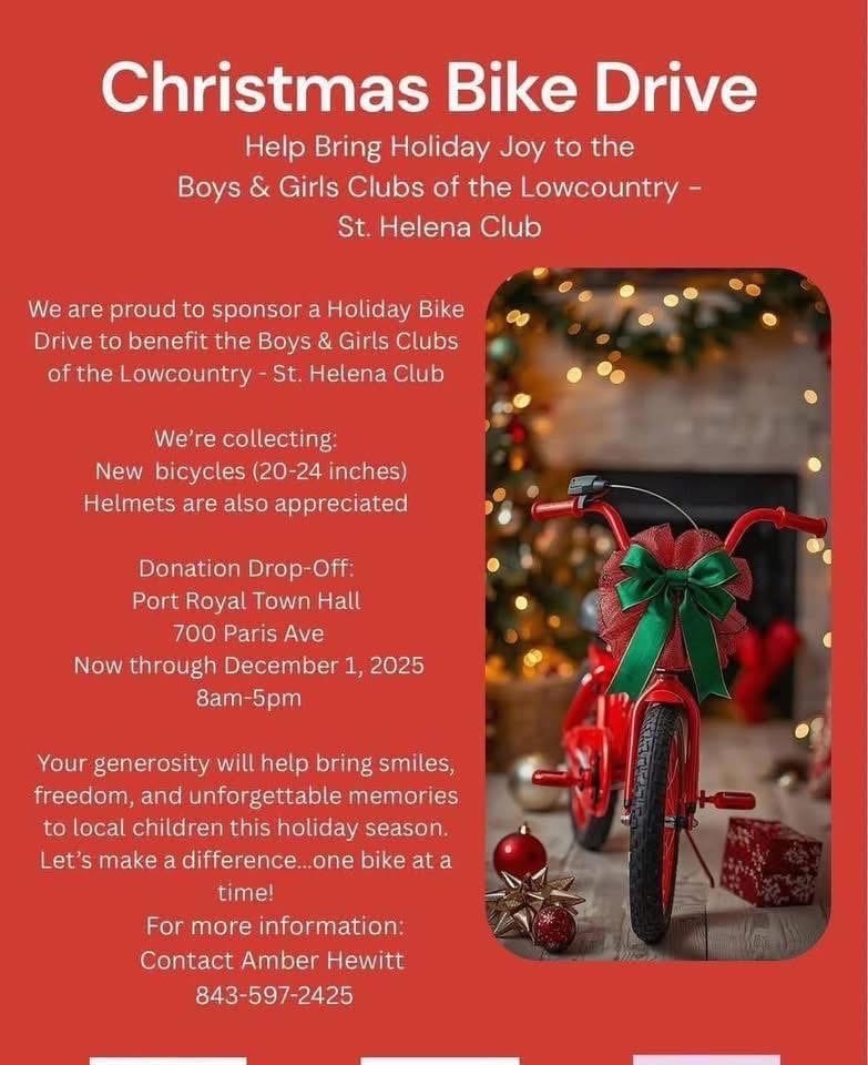 Help bring holiday joy to local children by donating a new bicycle (20–24 inches) or a helmet. All items benefit the Boys and Girls Clubs of the Lowcountry, St. Helena Club. Donations can be dropped off at Port Royal Town Hall from 8 AM to 5 PM. Deadline has been extended to December 15.