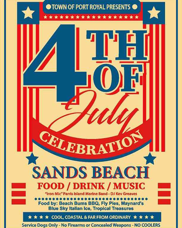 🎆 July 4: Independence Day Celebration in Port Royal | Festivities begin at 5:00 PM 📍The Sands, Port Royal. Live music, delicious eats from Beach Bums BBQ, Fly Pies, Maynard’s, Blue Sky Italian Ice & Tropical Treasures. Fireworks launch after sunset—bring your chairs and blankets for an evening of patriotic fun!