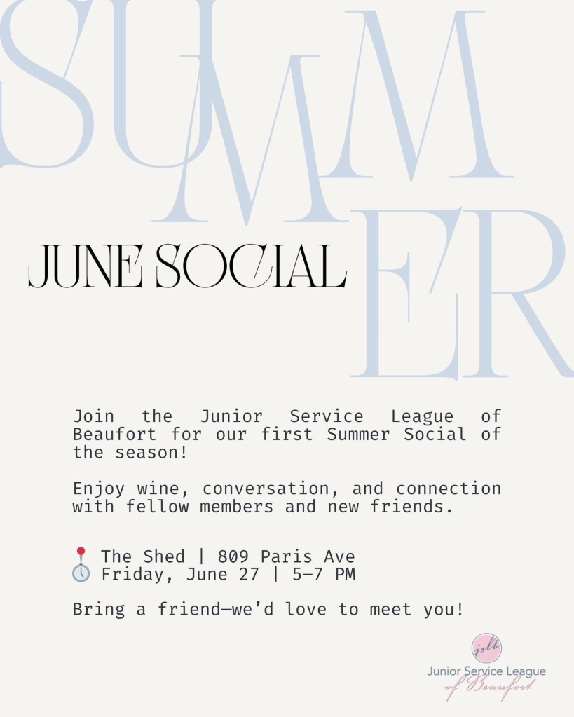 🍷 Friday, June 27: Junior Service League Summer Social | 5:00 PM – 7:00 PM 📍The Shed, 809 Paris Ave, Port Royal. Wine, conversation, and community—bring a friend and come meet the JSLB crew!