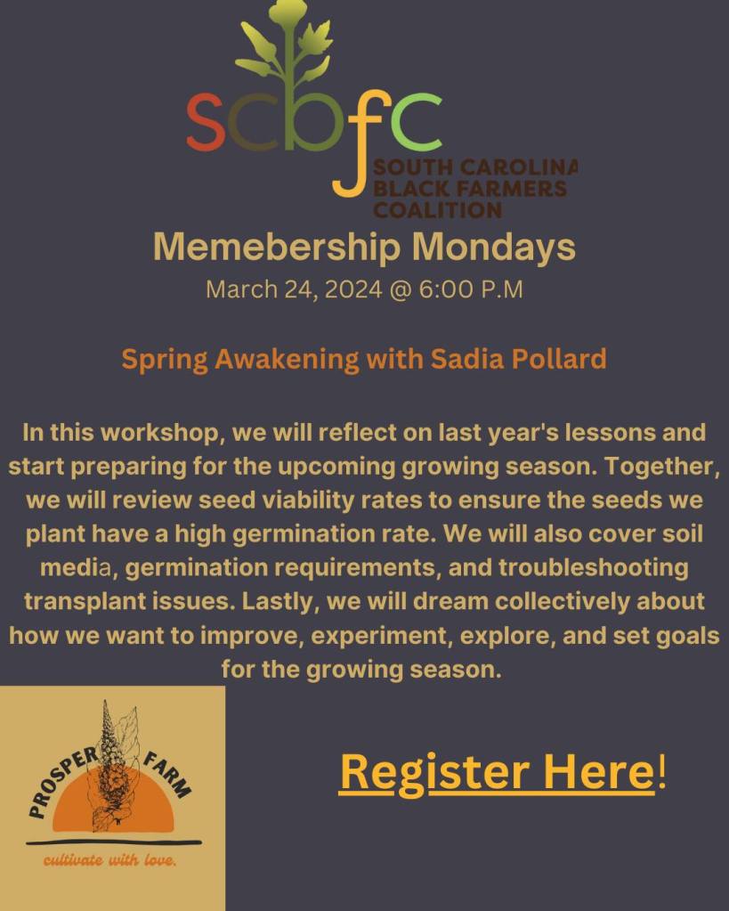 Join the SC Black Farmers coalition for Spring Awakening, a special workshop dedicated to reflecting on last year’s lessons and preparing for the upcoming growing season. This is an opportunity to connect with fellow farmers, share insights, and set the stage for a successful year ahead.