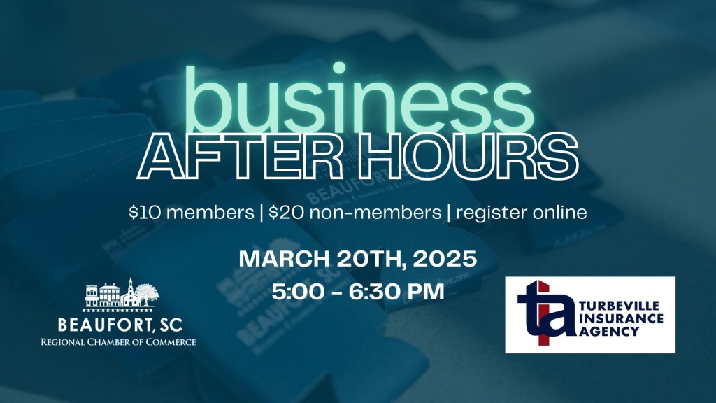 Connect with local professionals at Turbeville Insurance Agency’s Business After Hours on Thursday, March 20, 2025, from 5:00 – 6:30 PM. Hosted by the Beaufort Regional Chamber, this networking event offers the chance to build new business relationships while learning more about a trusted local insurance provider. Admission is $10 for members and $20 for non-members, with the event taking place at 28 Kemmerlin Lane, Beaufort, SC. Details here.