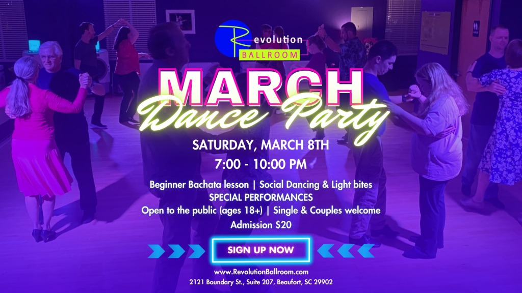 Dance the night away at the Revolution Ballroom Dance Party on Saturday, March 8! The evening kicks off with a Beginner Bachata lesson at 7:00 PM, followed by social dancing, special performances, and a mix of Ballroom, Latin, Swing, Salsa, Bachata, and Argentine Tango. Open to the public (ages 18+), admission is $20, and singles and couples are welcome. Dress to impress and join the fun at Revolution Ballroom, 2121 Boundary St, Suite 207, Beaufort, SC. Sign up here! 💃🕺