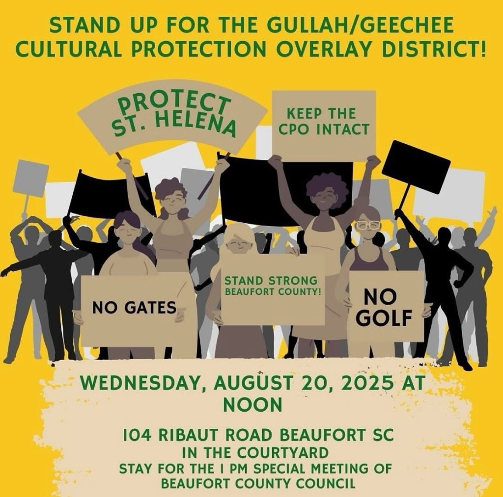 The demonstration is timed ahead of a special council meeting at 1 PM to urge County Council to oppose any special carve-outs to the Cultural Protection Overlay (CPO) for the existing 500-acre Pine Island property on St. Helena Island.