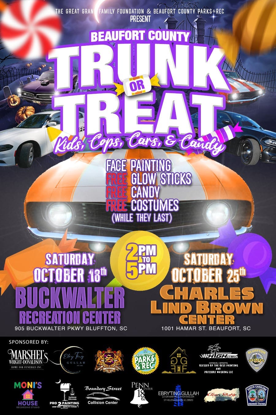Thu., Oct. 30 | 3–5 pm | 1905 Duke St, Ste 101, Beaufort | Family friendly trunk or treat hosted by Beaufort County DSS with decorated trunks, costumes, candy, and more.