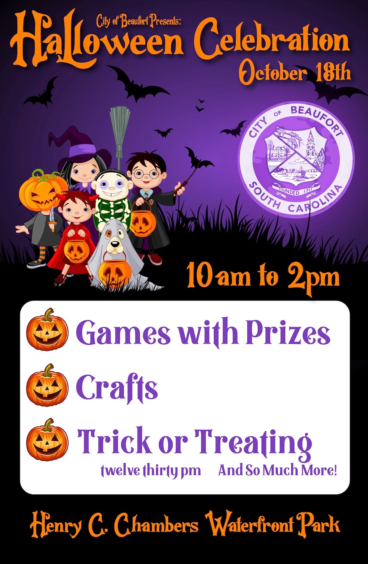 Sat., Oct. 18 | 10 am–2:30 pm | Henry C. Chambers Waterfront Park | Enjoy a family friendly Halloween celebration with games, activities, and community fun. Trick or treating begins at 12:30 pm.