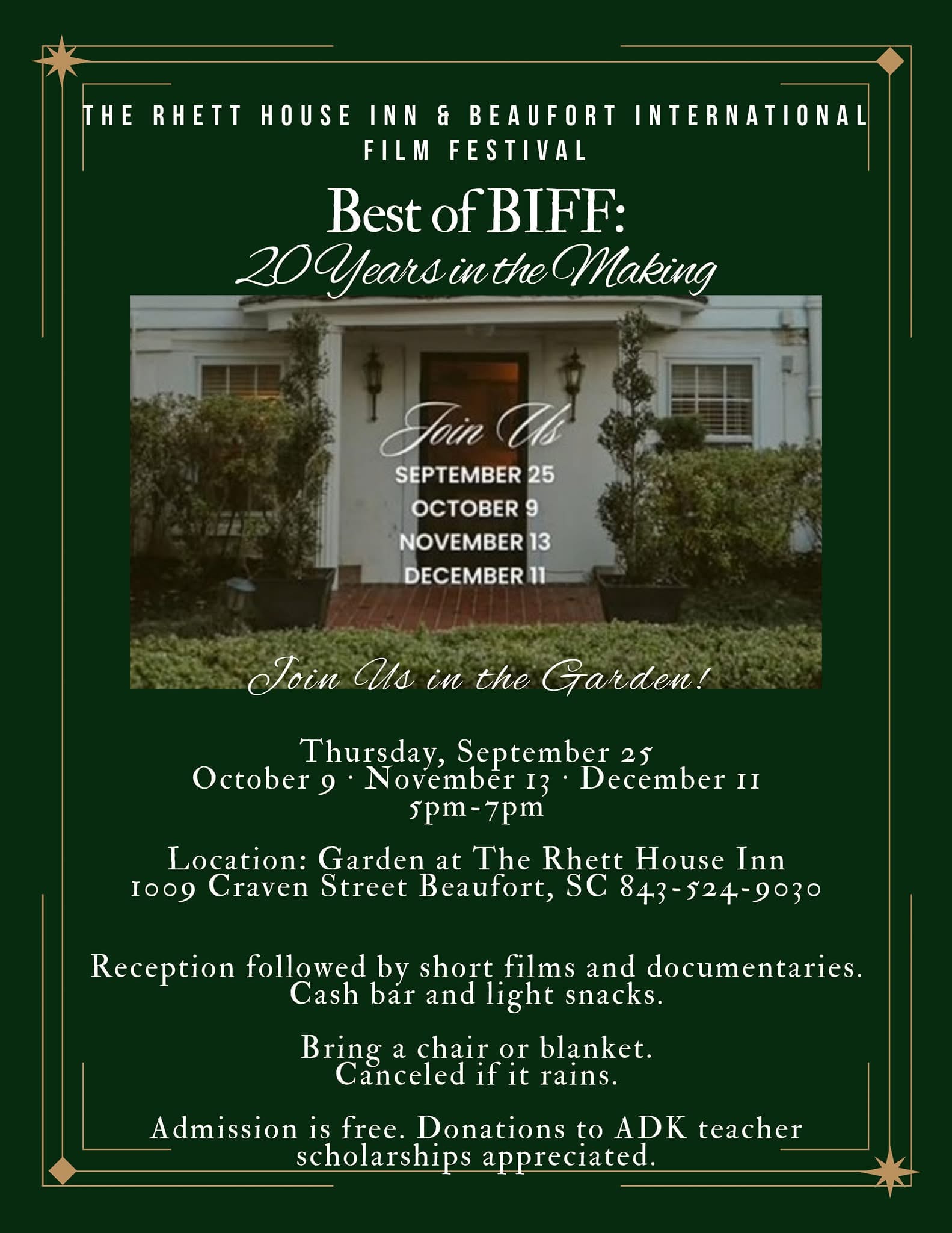 Thu. Oct. 9 | 5–7 PM | The Rhett House Inn, 1009 Craven St, Beaufort | Free (donations appreciated) Beaufort International Film Festival presents outdoor shorts and documentaries. Cash bar and snacks available.