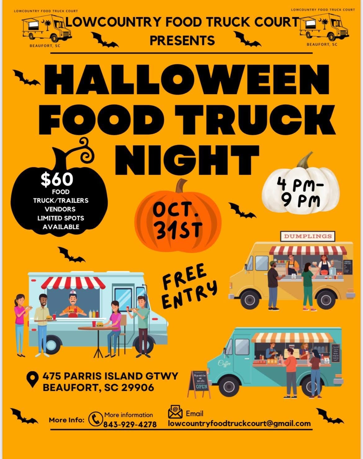 Oct. 31 | 4–9 PM | 475 Parris Island Gateway, Beaufort | Enjoy an evening of festive fun with food trucks, trailers, and vendors at the Lowcountry Food Truck Court. Free entry for all, with a wide variety of eats and treats available for purchase.