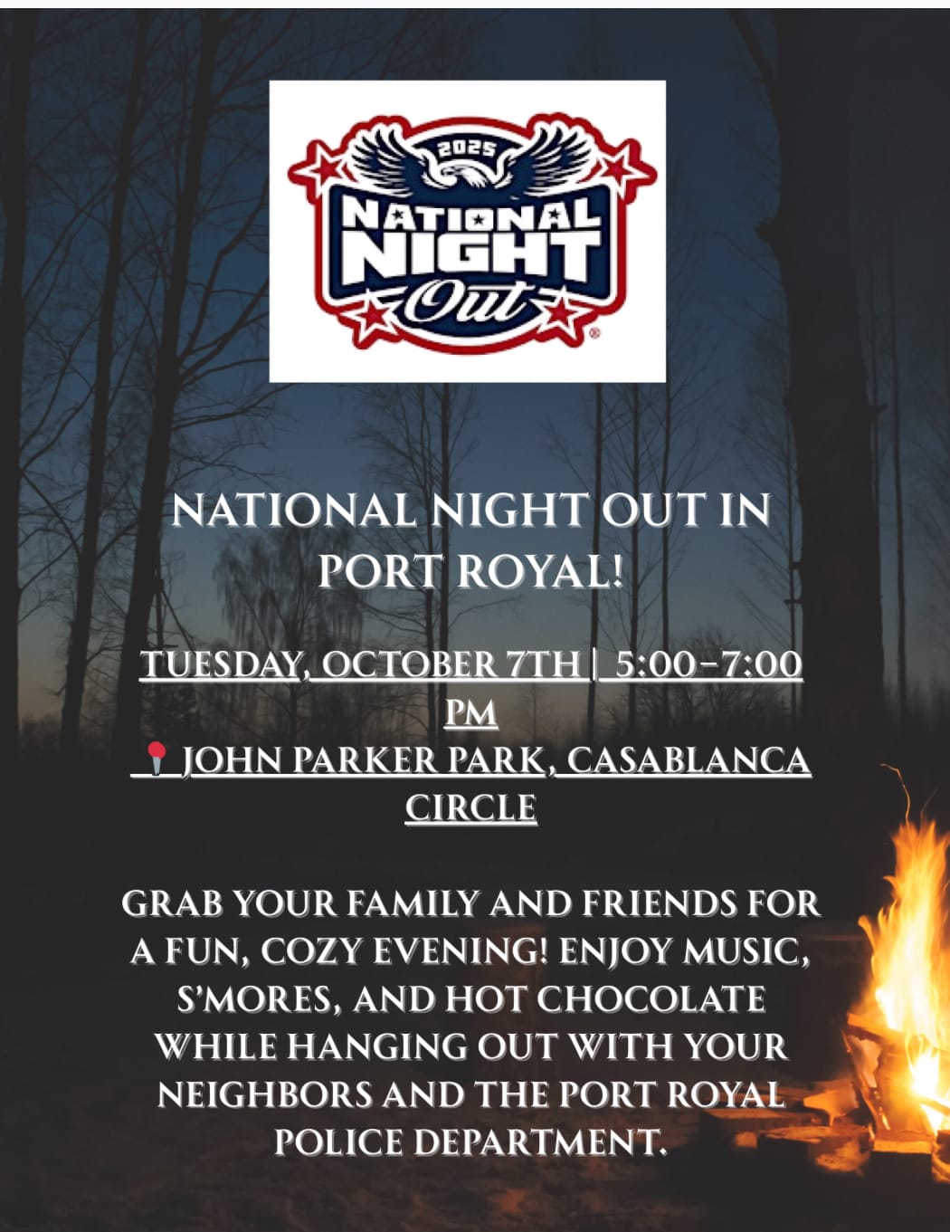 Tue., Oct. 7 | 5–7 pm | John Parker Park, Casablanca Circle, Port Royal | Gather with family, neighbors, and the Port Royal Police Department for an evening of music, s’mores, hot chocolate, and community connection around the fire.