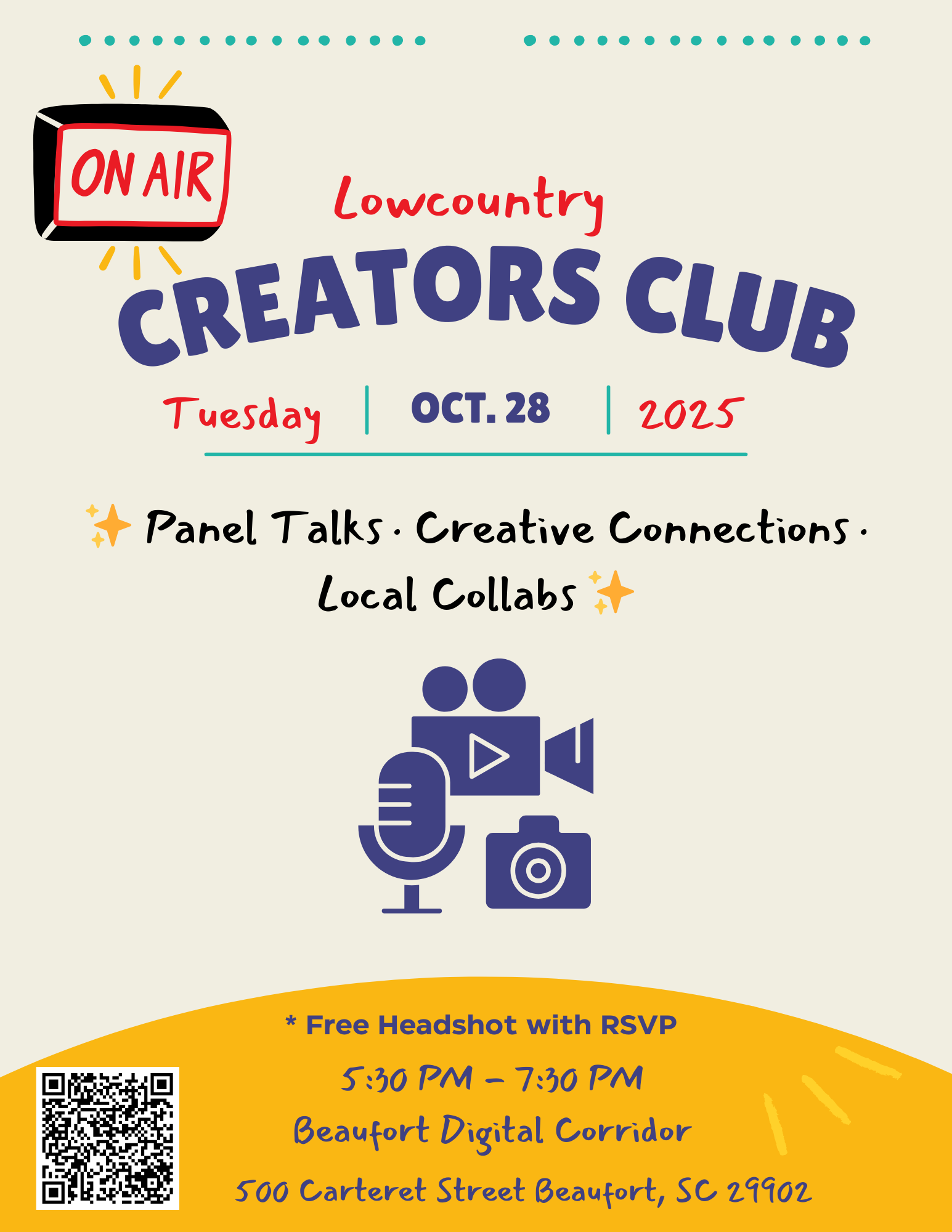 Tue., Oct. 28 | 5:30–7:30 pm | Beaufort Digital Corridor — A gathering for local creators (artists, writers, designers, entrepreneurs) to share ideas, network, and collaborate. Free event; RSVP required.