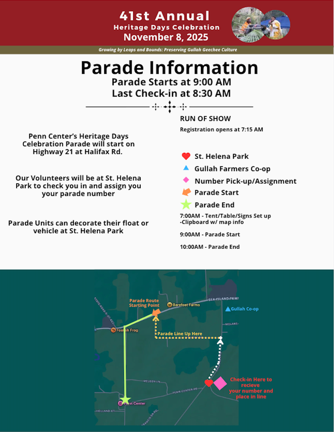 Heritage Days Parade — The parade kicks off from St. Helena Park on Ballpark Road, with volunteers opening the gates at 7 AM for participant registration at Halifax.
