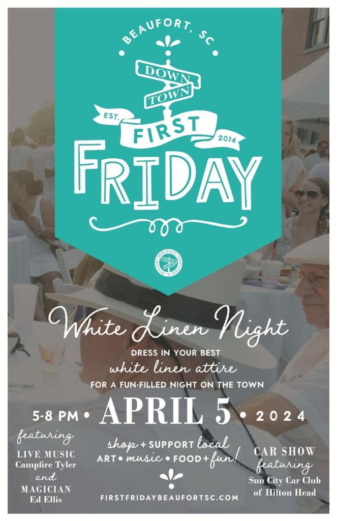 First Friday is on April 5 from 5-8 p.m. -- White Linen Night! Check out the car show, while you shop local, enjoy the music, and take part in the raffle for a fun night!