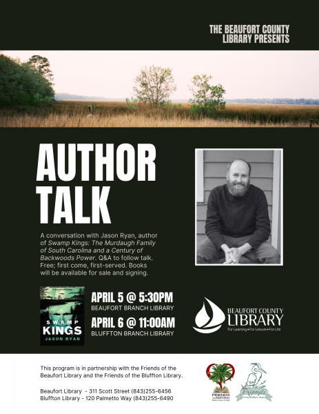 A conversation with Jason Ryan, author of Swamp Kings: The Murdaugh Family of South Carolina and a Century of Backwoods Power. Q&A to follow talk. Free; first-come, first-served. Books will be available for sale and signing.