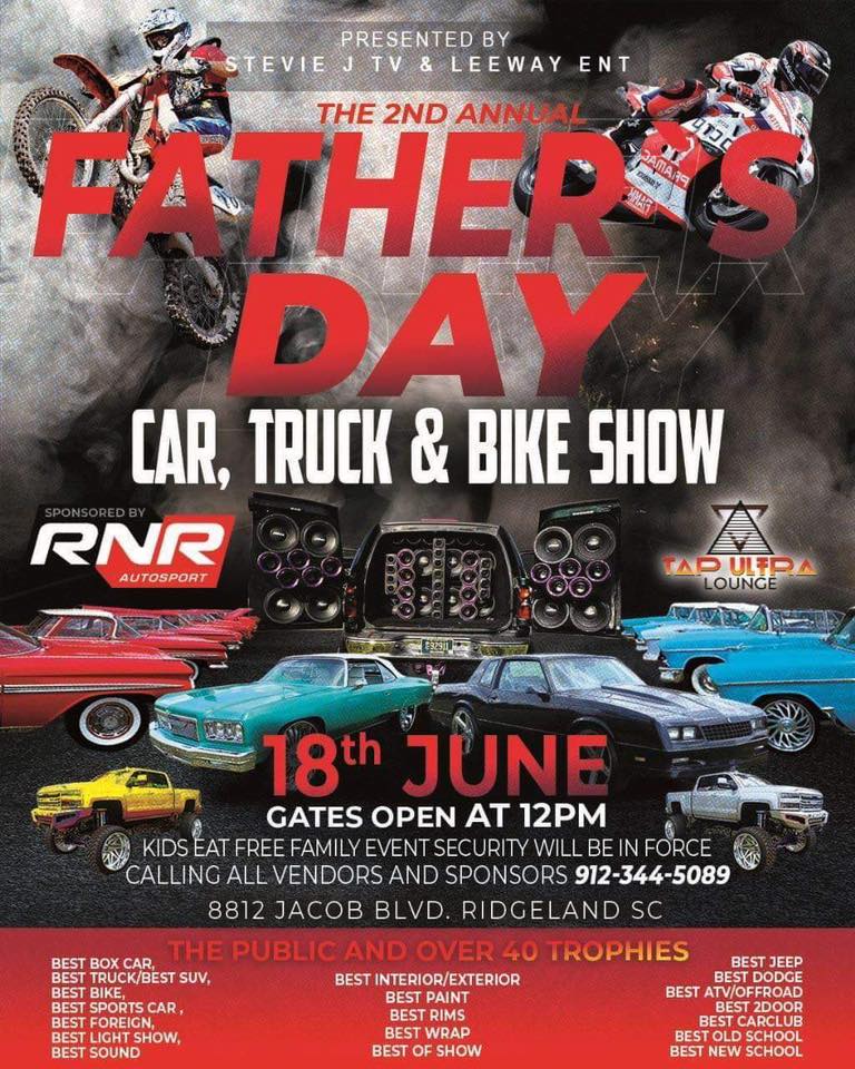 Fathers Day Car, Truck, and Bike Show | Noon | 8812 S Jacob Smart Blvd, Ridgeland | The folks over at Malakai Prime Media shared this epic Father's Day event for the entire family. A car, truck and bike show with over 40 Trophies to be awarded including Best Jeep, Best Wrap, Best Bike and more. Kids eat free at this family friendly event. Details here.