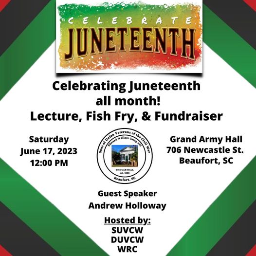 Celebrate Juneteenth | Noon | Grand Army Hall 706 Newcastle Street, Beaufort | Lecture and fish fry fundraiser featuring guest speaker Andrew Holloway. This event is hosted by the Sons and Daughter's of Union Civil War Veterans.