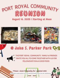 Port Royal Community Reunion invites friends, family, and vendors for a day of fellowship, food, and fun. Details.