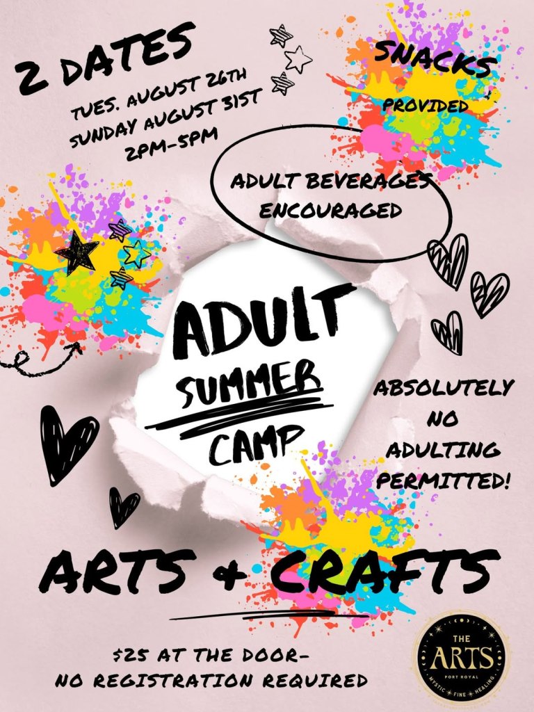 ๐จ Adult Summer Camp | Tuesday, August 26 and Sunday, August 31 from 2PM - 5PM at The Arts in Port Royal.$25 no RSVP required. ย Details.
