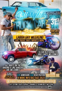 Sunday, August 31, 2025 ๐ Gates Open at 12 PM |๐630 Campground Rd, Yemassee, SC. Chill Willโs Truck, Car & Bike Show features classic cars, custom builds, golf carts, and more. Hosted Labor Day Weekend with DJ Bronx Izz. $20 admission | $30 registration.