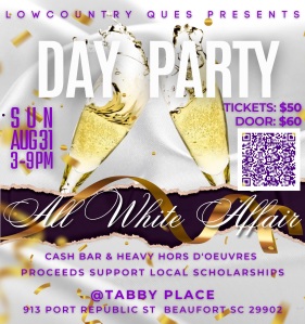 Sunday, August 31 from 3-9 p.m. ๐Tabby Place 913 Port Republic Street. Grab your white attire and head downtown for this festive day party. Event proceeds support local scholarships. Hosted by Lowcountry Ques. Click here for tickets.