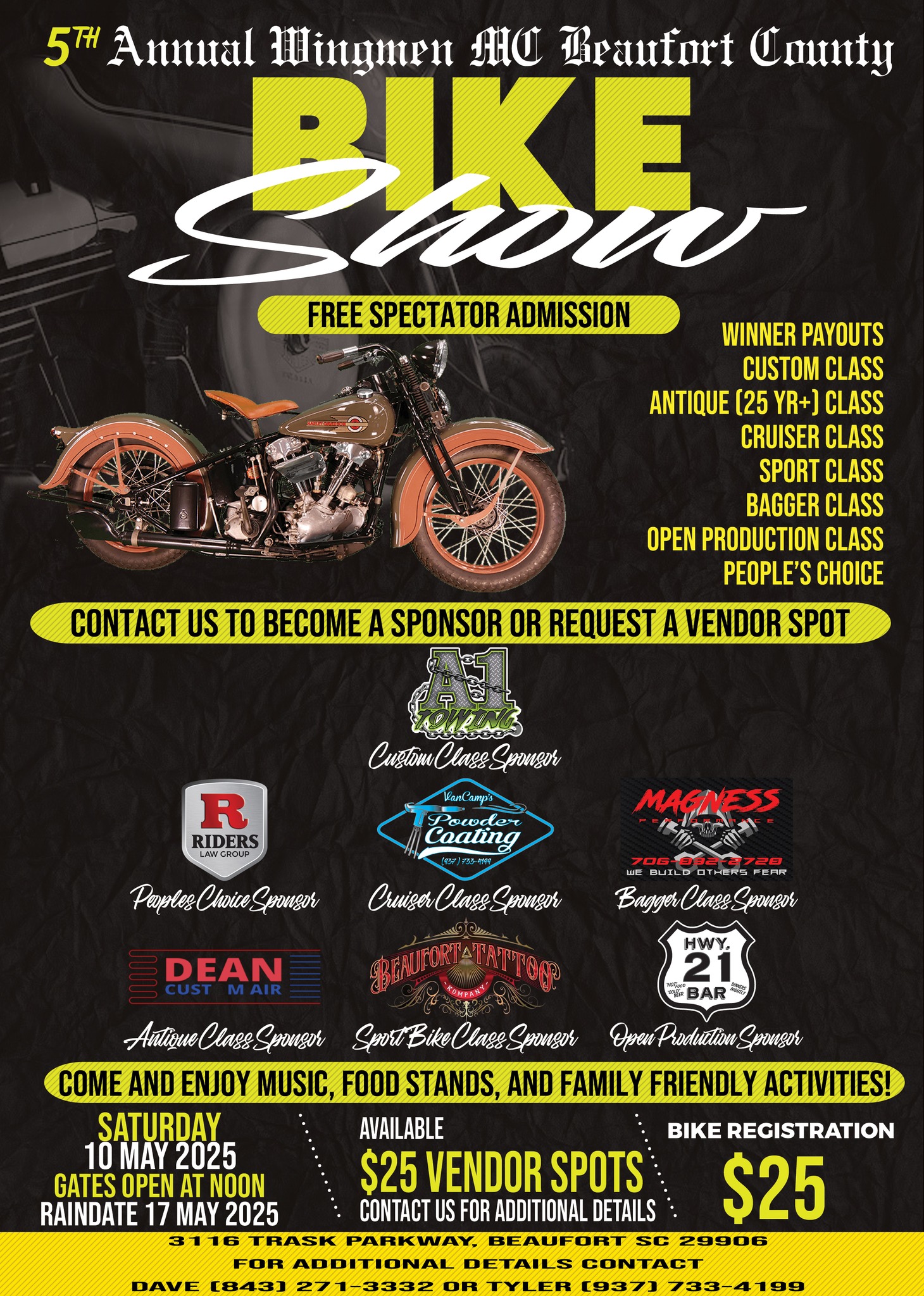 🏍️ Saturday, May 10 – Beaufort County Bike Show - The fifth year of this event revs up from 12:00 PM to 3:00 PM 📍 3116 Trask Parkway, Beaufort. Enjoy a showcase of bikes, vendors, and family fun. Details.