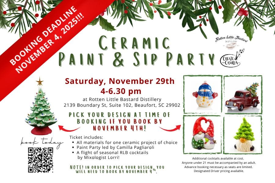 Get ready for a festive night of creativity and cocktails at the Ceramic Paint & Sip Party, hosted by Create With Camilla at Rotten Little Bastard Distillery. Choose your favorite holiday design—Christmas trees, snowmen, gnomes, or vintage trucks—and paint your masterpiece while sipping a flight of seasonal RLB cocktails. Tickets include all materials, guided instruction by artist Camilla Pagliaroli, and plenty of holiday cheer. Space is limited, and designs can be reserved in advance if booked by November 4. Gather your friends for an unforgettable evening of color, laughter, and Lowcountry spirit.