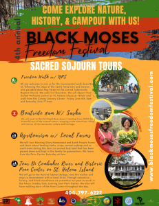 - 12:00 PM – "Black Moses on the Combahee River" presented by De Gullah Way Performing People + Communal Lunch